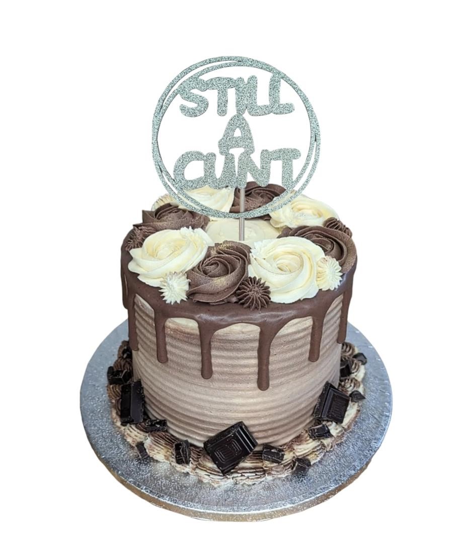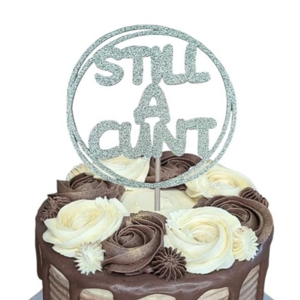 Crafted from premium 250gsm non-shed gold glitter card, this topper boldly declares that the birthday person is “Still A Cunt.”